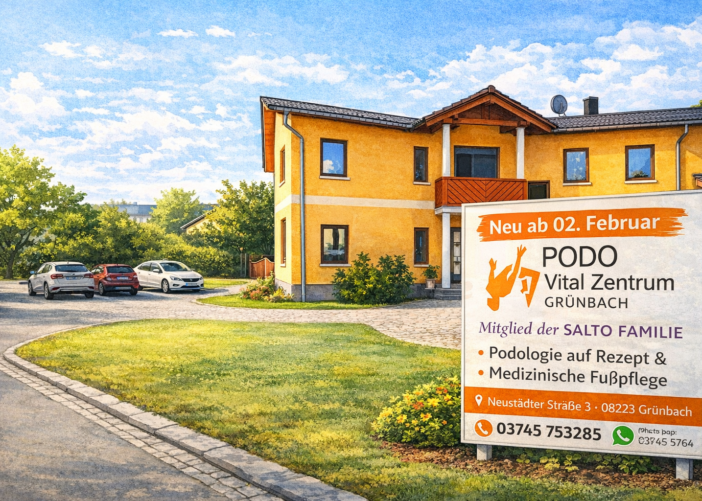 Das Podo Vital Zentrum ist ab dem 2. Februar 2026 Teil der Salto-Vital-Familie. Am bisherigen Standort des ehemaligen Fachinstituts für Podologie in Grünbach bei Falkenstein im Vogtland führen wir die Praxis mit bewährter Qualität, modernen Standards und einem ganzheitlichen Behandlungskonzept weiter.